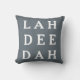 Decorative throw pillow printed Lah Dee Dah on faux blue grey Irish linen background.