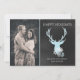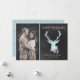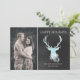 Stylish, rustic, flat holiday greeting card done in a charcoal grey chalkboard look, on the right, and a custom photo on the left side. Graphics of an aquamarine deer head, with aqua glitter looking antlers, decorates the chalkboard side of the card. Pretty white and aquamarine coloured snowflakes decorate the bottom of the deer. Personalise the white text fields to suit your Christmas card needs.