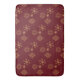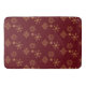 A bathmat with a repeating pattern of fancy golden snowflakes with elegant crystalline shapes. A dark red background.