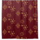 A shower curtain with a repeating pattern of fancy golden snowflakes with elegant crystalline shapes. A dark red background.