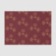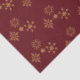 A tissue paper with a repeating pattern of fancy golden snowflakes with elegant crystalline shapes. A dark red background.