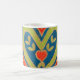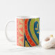A white coffee mug with a decorative heart design in red, blue, green and gold from a watercolour painting by Judy Adamson.