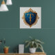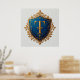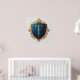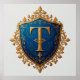 Ornately designed heraldic shield featuring a golden letter T surrounded by intricate gold embellishments on a blue background. Elegant detail evokes themes of tradition, royalty, and sophistication.