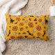 Decorative pillow with a modern minimalist design for Halloween, a pattern of silhouettes of skulls, ghosts, cobwebs, a silhouette of a cat, pumpkins on yellow background.