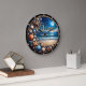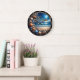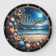A decorative wall clock featuring seashells and starfish set against an ocean beach and night sky, evoking serene coastal vibes.
