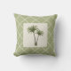 Pillow with palm trees and bamboo lattice design on green background. See all the coordinating pillow designs at Sandy Feet Studios.