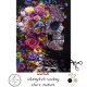 This unique decoupage design features an intricate human skull enveloped in vibrant flowers, blending elements of life and death in a striking visual contrast. The skull itself is adorned with delicate floral patterns, while larger blooms like roses, daisies, and peonies surround and intertwine with the skeletal structure, creating an ethereal yet thought-provoking aesthetic. The dark background amplifies the brilliance of the flowers, making their colours pop with intensity.