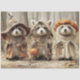 Halloween racoon forest scene, whimsical woodland costume critters, rustic autumn animal design, cute trick-or-treat raccoons, pumpkin hat forest friends, wizard racoon Halloween art, fall leaves forest background, cosy Halloween animal trio, festive racoon costume illustration, enchanted woodland Halloween decor