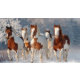 Pinto horses galloping in snow, winter horse photography, majestic pinto horse in motion, snowy equestrian landscape, wild horses in winter, powerful horse herd running, scenic winter horse imagery, brown and white pinto horses, dynamic horse movement in snow, breathtaking equine action shot