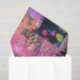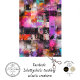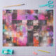The image is an abstract artwork composed of a grid of squares, each filled with various colours, textures, and patterns. The colours range from vibrant pinks, purples, and oranges to darker shades of black and grey. Some squares feature splatters and streaks of paint, while others have geometric patterns or textured surfaces. The overall effect is a visually dynamic and chaotic composition, with a mix of organic and structured elements.