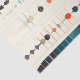 The image is an abstract artwork featuring a variety of geometric shapes and patterns arranged vertically. The shapes include circles, triangles, diamonds, and lines in various colours such as blue, orange, and beige. The patterns are intricate and symmetrical, creating a visually engaging and complex design.