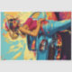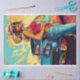A stylised illustration of a person standing beside a classic car. The person is wearing a wide-brimmed hat, a red top, and denim jeans. The car has prominent tailfins and round headlights, indicative of vintage American automotive design. The background features abstract splashes of yellow, blue, and red colours, adding a vibrant and artistic touch to the scene