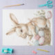 Easter scene brown rabbit, pink ribbon, pastel-coloured decorated eggs, floral designs, small flowers, green leaves, captures the festive and charming essence of Easter and spring celebrations. Easter decorations, greeting cards, festive illustrations, springtime imagery, and holiday-themed marketing materials.