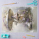 This enchanting digital painting features a whimsical mushroom house adorned with delicate gold filigree, blooming flowers, and intricate details that evoke a fairytale charm. The soft hues of lavender, ivory, and pastel pink create a dreamy atmosphere, making it look like a cosy dwelling for magical creatures. A tiny, ornate staircase leads up to the warmly lit entrance, while charming teacups and decorative elements add to the fantasy-inspired aesthetic. Surrounded by lush wildflowers and mossy textures, this piece beautifully blends nature and imagination into an ethereal scene.