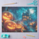 Enter a twilight world where jack-o’-lanterns flicker like sentinels and a haunted house looms in gothic splendour. This atmospheric design features glowing pumpkins with expressive faces lining a misty path, leading straight to an eerie manor crowned by turrets and glowing windows. Bats swirl above a full moon, while twisted trees stretch like curious spectators over golden leaves.