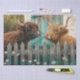 This digital art is created in the landscape mode for decoupage papers. This is a photo that features a picturesque countryside scene with a couple of adorable highland cows grazing in front of an old, weathered barn. In the background, a of an old painted barn in teal and real wood colours give it a a touch of nostalgia, with daisies in front of the old fence. This charming and serene setting captures the essence of rustic beauty and rural life. Digital art created by RHDesigns for decoupage, scrapbooking, posters and canvas art.