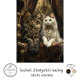 The image shows two cats sitting on an ornate, luxurious chair. The cat on the left is a tabby with a fluffy coat and striking green eyes, adorned with elaborate jewellery featuring pearls and gemstones. The cat on the right is a white cat, also wearing intricate jewellery with pearls and gemstones. The background is richly decorated with gold and intricate patterns, adding to the opulent setting. This image is interesting due to the juxtaposition of the regal, human-like adornments on the cats, creating a whimsical and luxurious scene.