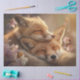 This image captures a mother fox and her baby curled up together, peacefully sleeping. Their fur is soft and detailed, with warm tones blending harmoniously into the cosy scene. The baby fox nestles close to its mother, reinforcing a sense of comfort, protection, and deep familial bond. The overall composition evokes warmth and tenderness, embodying the quiet beauty of nature and parenthood. The lighting and textures add to the serene atmosphere, making this a heartwarming and visually soothing piece.