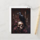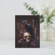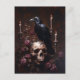 A black raven perches atop a human skull surrounded by deep red and purple roses, thorny branches, and glowing candles