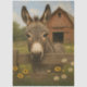 A gentle donkey stands behind a weathered wooden fence, framed by blooming daisies and orange blossoms. The red barn in the background, with its pitched roof and open door, evokes the quiet charm of rural life. Trees and greenery soften the horizon, creating a peaceful, pastoral atmosphere ideal for farmhouse-style prints, decoupage, or country-themed branding.