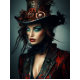 This image showcases a woman dressed in an elaborate steampunk-inspired outfit. The ensemble features a striking red and black jacket with intricate patterns and textures, paired with a dramatic black lace collar. Atop their head sits an ornate steampunk-style top hat, adorned with gears, feathers, and complex metallic embellishments. The overall look beautifully blends Victorian-era fashion with industrial and mechanical elements, creating a bold and artistic aesthetic. The details in the clothing and accessories bring a rich sense of creativity and depth to the scene, making it visually captivating.