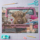 The image features a Highland cow with long, shaggy fur and large horns sitting in the bed of a pink pickup truck. The truck bed is adorned with various cosy items, including blankets, pillows with heart designs, and candles. Rustic decorations such as a wicker basket and wooden elements add to the charm. The setting appears to be during the evening or early morning, as the background suggests a dimly lit outdoor environment. This scene combines the rustic charm of a Highland cow with the whimsical and cosy decor of the truck bed, creating a visually appealing and unique atmosphere. The use of soft colours and heart motifs adds a touch of warmth and affection to the image.
