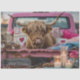Highland cow, pink pickup truck, cosy decorations, blankets and pillows, heart designs, rustic charm, wicker basket, whimsical scene, evening setting, RHDesigns by 2chattychicks.