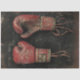 Vintage boxing gloves, worn leather, hanging display, dark background, nostalgic sports memorabilia.