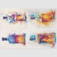 The image shows four artistic illustrations of liquor bottles, each with a unique and vibrant watercolor splash background. The bottles are depicted with varying shapes and colours, creating a visually appealing and dynamic composition. This image is interesting and relevant for its artistic representation of common objects, showcasing creativity and the use of colour to enhance the visual appeal of everyday items.