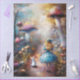 The image depicts a fantastical scene featuring a young girl with long blonde hair, wearing a blue dress and a large blue bow, walking down a path in an enchanted forest. She is accompanied by a white rabbit. The forest is filled with oversized, colorful mushrooms, some of which are taller than the girl. The atmosphere is magical, with a blend of warm and cool colors, creating a dreamlike ambiance. The scene is reminiscent of a fairy tale or fantasy story, evoking a sense of wonder and adventure.