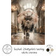 The image depicts a cat dressed in an elaborate and ornate costume. The cat is wearing a black outfit adorned with pearls and lace, along with a large pendant hanging from its neck. The cat also has on a pair of decorative, bejeweled sunglasses and is holding a parasol decorated with lace, pearls, and floral elements. The background appears to be an elegant, possibly historical, indoor setting with high ceilings and arched windows, suggesting a grand or luxurious environment. This image is interesting and relevant due to the juxtaposition of a domesticated animal in high-fashion attire, which is both whimsical and visually striking.