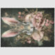 Detailed easter rabbit illustration, floral designs, artistic depiction, vibrant colours. Pink peach flowers, high detail, dark background, vivid contrast. Wildlife element, botanical theme, enchanting artwork, whimsical feel.