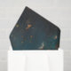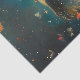 The background is a deep teal-blue, speckled with small, glittering particles that add depth and a sense of cosmic wonder.