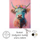 Highland cow with a crown of flowers, set against a pink background. The cow’s long, shaggy hair is rendered in vibrant shades of blue, orange, and white, creating a whimsical and colourful portrait. The calm and neutral expression of the cow adds to the serene and charming atmosphere of the artwork. This piece beautifully combines elements of rustic charm with artistic flair, making it a delightful addition to any collection