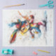 This vibrant and colourful artwork features a rabbit depicted in an abstract style with dynamic brush strokes and splashes of paint in various colours, including blue, red, orange, and yellow. The predominantly white background with streaks of colour suggests movement, giving the impression that the rabbit is in motion. This energetic representation captures the liveliness and spirit of the rabbit, blending realism with artistic flair
