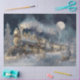 This enchanting winter night scene captures the wonder of a vintage steam locomotive gliding through a snowy forest, its golden accents glowing against the moonlit sky. Sparks and steam swirl into the crisp air as the train passes a majestic deer standing quietly in the foreground, gazing at the spectacle. Nestled among snow-covered trees in the distance, a warmly lit lodge or station adds a cosy touch, suggesting arrival, warmth, and holiday magic. The full moon casts a gentle glow over the entire composition, blending nature, nostalgia, and festive charm in perfect harmony.