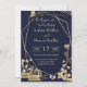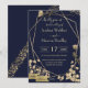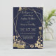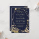Deep midnight blue and champagne beige combine with geometric frames create a modern and unique, yet thoroughly romantic invitation to your nuptials. Reverse has simple diagonal path of flakes of gold (printed, looking real but trompe l'oeil)