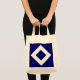 A deep blue diamond is surrounded by a thick white border in the centre of this bold, geometric pattern. The white diamond border is flanked by four dark blue triangles in the corners.