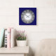 A dramatic clock design in dark blue with a round illuminated centre of silver grey. White numerals and silver clock hands complete this design. Easy change to from square to round or add a frame.