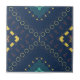 This is a captivating decorative ceramic tile that exudes an air of elegance and sophistication. The tile features a symmetrical pattern of geometric shapes, beautifully rendered in hues of yellow, brown, light blue, against a dark blue backdrop. At the heart of the design is a central diamond with a light blue centre and yellow edges, surrounded by an intricate arrangement of yellow circles and brown rectangles. This exquisite piece is sure to add a touch of charm and allure to any space it adorns.