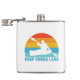 The flask itself is fine. It’s a cheap flask, obviously bought in bulk, however am prepared to overlook that. Given that it is a personalized item, I would have liked to have seen gift boxing instead of the generic packaging. Terrible printing, and/or quality. It’s a cheap, tacky vinyl. It is not cut straight and is also applied in a way that it is overhanging the bottom, causing the glue to catch on items and it will eventually roll and tear, damaging the wrap.
