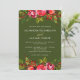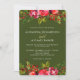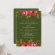 This elegant Christmas season wedding invitation features beautiful red and green flowers, berries, and leaves, with modern faux gold calligraphy on a deep green background.