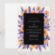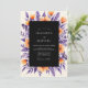 This design features a striking contrast between deep purple foliage and vibrant orange blooms. Hand-painted watercolor elements include delicate lavender sprigs and lush ranunculus blossoms set against a dark, moody backdrop. The rich color palette creates an atmospheric and sophisticated aesthetic perfect for an autumnal or late summer event. Elegant botanical details surround the middle, offering a lush and artistic floral arrangement.