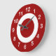 This is a very simple clean design for those that enjoy the uncluttered look. Features deep red, and white circles within each other, with the deep red circle on the inside...looks a little like a target! The clock has white numerals, and comes in three styles, a smaller clock and a square shape.