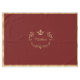Elegant deep red coloured cloth table cloth with and gold tone border and graphics of a gold tone flourish and crown text area and custom text. Personalise the text to this lovely addition to your dining table.