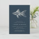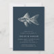 Our coastal chic engagement party invitations feature a vintage etched style fish illustration in creamy off white on a navy blue background. Personalise with your engagement party details beneath.