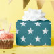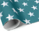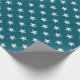 A festive wrapping paper featuring a dark teal blue background with shimmering silver stars in a repeat pattern.