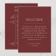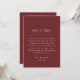 This wedding weekend card combines a clear event timeline with a short welcome message, helping guests understand the flow of the celebration from start to finish. The front lays out the full schedule (from the night before to the wedding day and the morning after) so everything is easy to follow at a glance. The reverse side includes a simple welcome message. It’s a practical addition to your invitation suite, especially for multi day weddings where guests need a quick overview of what’s happening and when. The deep wine red background gives the card a rich, refined look that works particularly well for evening events and weddings with deeper colour palettes. Pairs naturally with modern elegant, classic, minimalist, and romantic wedding styles, and fits especially well with fall and winter weddings. Available as both a printed card and a digital download.