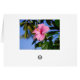 This card featuring a deep yellow hibiscus with a white throat is perfect to personalise for many occasions. In the background is a tropical garden, crowned by a coconut palm. On the back of the card is a beautiful pink hibiscus.