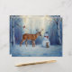A funny scene of a deer eating the carrot nose of a snowman and a bunny rabbit begging for a piece.